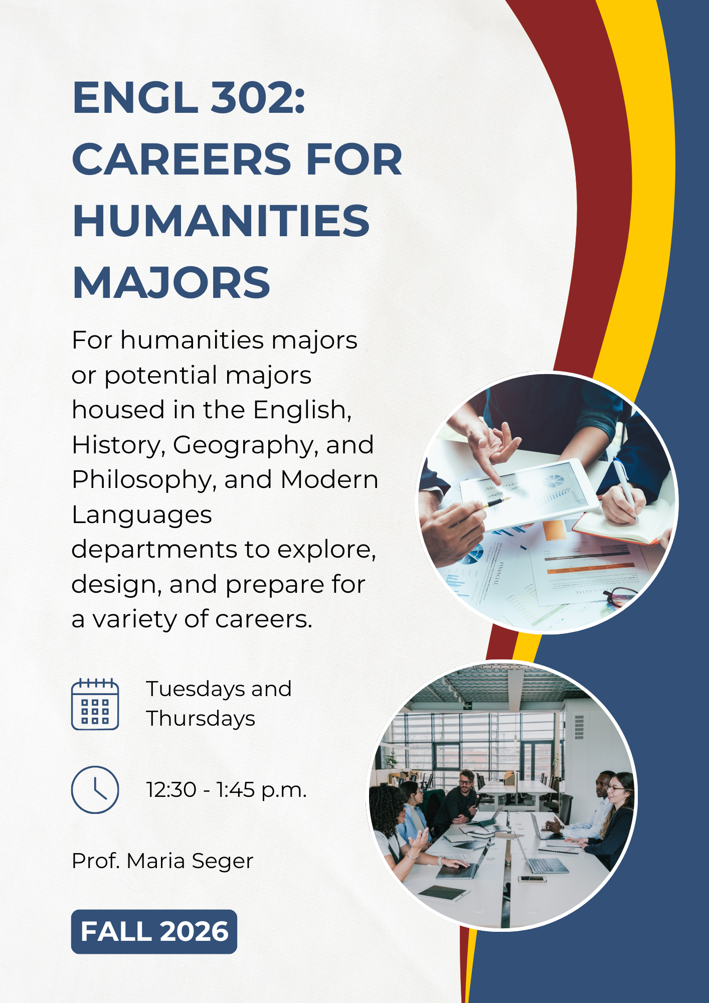 This course is designed for humanities majors or potential majors housed in the English, History, Geography, and Philosophy, and Modern Languages departments to explore, design, and prepare for a variety of careers. The course will expose you to the versatility of the humanities degree and the multiple different career paths available to you through professional assessments, alumni networking, and community engagement. You’ll also learn about career design through self-reflection and design thinking with texts such as Bill Burnett and Dave Evans’s Designing Your Life: How to Build a Well-Lived, Joyful Life (2016) and assignments like an odyssey plan and statement of intent. Finally, you’ll prepare for your career through practical professionalization assignments, including developing a resume and Handshake/LinkedIn profile, informational interviewing, searching and applying for internships or summer research opportunities, and/or pursuing post-graduate opportunities. Through formulating and executing a community-based class project in which students take on different roles, you’ll develop practical skills in leadership, teamwork, and self-development while deepening your existing skills in critical thinking, communication, and equity and inclusion.