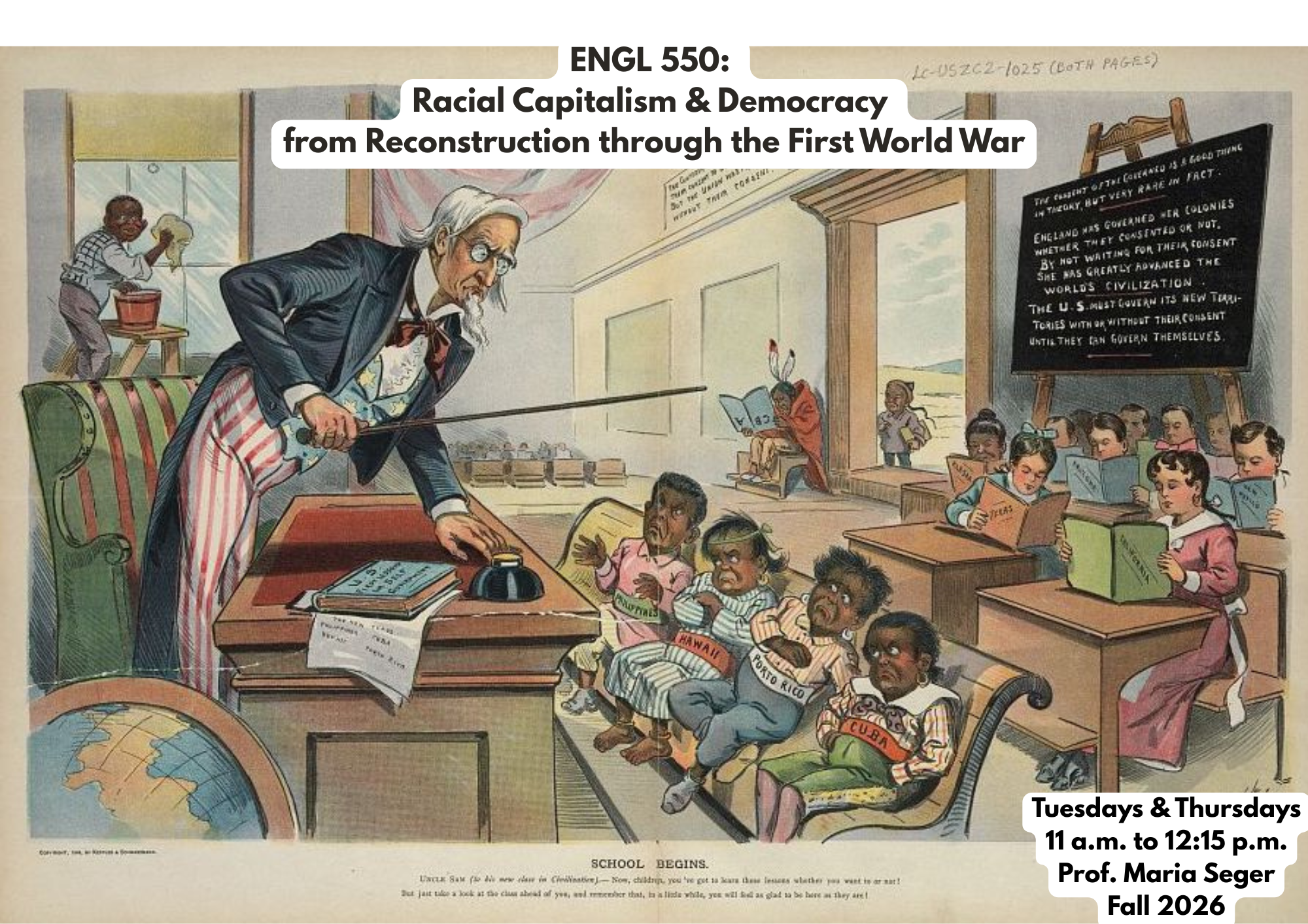 This seminar will investigate how racial capitalism—the notion that “racism enshrines the inequalities that capitalism requires,” in the words of Jodi Melamed—animates the US literary and cultural imaginary from Reconstruction (1863–77) through World War I (1914–18). In doing so, we’ll necessarily examine how the development of racial capitalism impacted the conception and execution of democracy in the United States, especially during westward (and later global) imperialism, Jim Crow, the Gilded Age, and the Progressive Era. If democracy is, as Fred Moten has described it, “government in which the common people hold sway,” how has racial capitalism impacted the practice of democracy? What does democracy look like in a racial capitalist nation? Attending to the work of authors such as Charles W. Chesnutt, Stephen Crane, W. E. B. Du Bois, William Dean Howells, María Ruiz de Burton, Sui Sin Far, Mark Twain, Ida B. Wells, and Zitkála-Šá, we’ll investigate how US literary and cultural texts understood and responded to the structural inequities and liberatory potentials of one of the most tumultuous periods of US history. Thus, this seminar will introduce a variety of methodological approaches to the field of US literary and cultural studies, including methods from Black studies, comparative race and ethnic studies, disability studies, Marxist studies, queer studies, and women of color feminisms. Course assignments may include leading seminar discussion, various scaffolded assignments culminating in a conference presentation and research article, and a public-facing project.