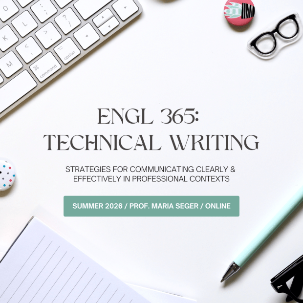 In this eight-week asynchronous online course, you’ll develop the skills necessary to communicate complex information clearly and effectively in professional contexts. To do so, we’ll practice understanding how to identify the audience, purpose, and context for professional communications, as well as learning their standard formats and modes. We’ll think of communication as a process, editing and proofreading for style and correctness, and we’ll conduct and reference research to inform, instruct, and persuade. The bulk of our projects this summer will center on advocating for an issue on our campus. By the end of the course, you’ll have a portfolio of sample communications that you can use for professional opportunities.